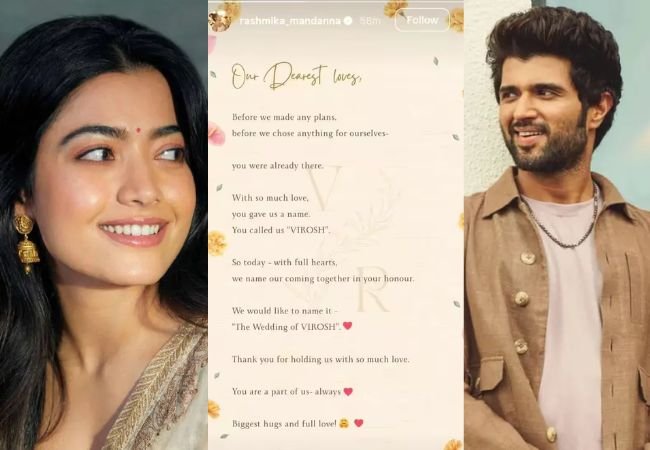 रश्मिका मंदानाने इन्स्टाग्रामवर स्टोरी पोस्ट करत लिहिलं आहे की, ‘आमच्या चाहत्यांनो, आम्ही कोणताही प्लॅन करण्यापूर्वी, आम्ही स्वतःसाठी काही निवडण्यापूर्वी, तुम्ही आमच्यासोबत होतात. तुम्ही आम्हाला प्रेमाने नाव दिलंय, VIROSH म्हणून आज, खूप प्रेमाने आम्ही आमच्या लग्नाला एक नाव देतोय. ‘विरोश’चं लग्न. प्रेमाने आमच्या पाठीशी कायम उभं राहिल्याबद्दल धन्यवाद. तू नेहमीच आमच्यासोबत राहाल. खूप प्रेम.’ विजयने देखील स्टोरी रिपोस्ट केली असून चाहत्यांनी आनंदाने त्यांच्यावर शुभेच्छांचा वर्षाव केला आहे. (Vijay & Rashmika Marriage)