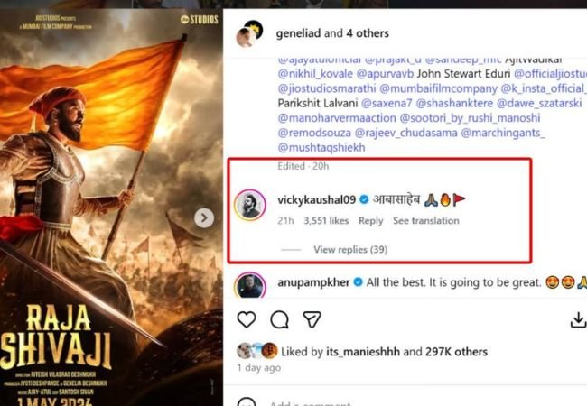 अभिनेता विकी कौशल याने राजा शिवाजी चित्रपटाला शुभेच्छा देत रितेशच्या शिवरायांच्या भूमिकेतील चित्रपटाच्या पोस्टवर आदराने “आबासाहेब…” अशी कमेंट केली आहे. विकीच्या या कमेंटची प्रचंड चर्चा रंगली आहे. विकी कौशलने अशी कमेंट करत रितेशला मानाचा मुजरा दिला आहे. ही कमेंट सोशल मीडियावर मोठ्या प्रमाणात व्हायरल होत असून चाहत्यांकडून ‘शंभूराजेंनी शिवरायांना दिलेली ही साद’ असल्याचे म्हटले जात आहे. (Riteish Deshmukh Raja Shivaji Movie)
