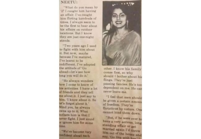 पुढे नीतू असं देखील म्हणाल्या की, “ऋषी याचं आऊटडोअर शुटींग असलं की त्यांच्या प्रत्येक अफेरबद्दल मला कसं कळतं याचं त्यांना आश्चर्य वाटायचं… शिवाय, त्यांना मला सगळं माहित असूनही मी शांत कशी राहते ही गोष्ट खटकायची… पण नंतर भांडण न करता मी या विषयांवर बोलणं बंद केलं आणि माझं आयुष्य जगू लागले… कारण मला माहित होतं की, ऋषी माझ्याशिवाय राहू शकत नव्हते. काहीही झाले तरी, त्यांना कुटुंबच निवडावं लागणारं होतं”…या मुलाखतीवेळी नीतू यांची पुरुषांच्या स्वभावावर प्रकाशझोत टाकत असं म्हटलं की,“फ्लर्टिंग हा पुरुषांचा मुळ स्वभावच आहे. त्यामुळे त्यांना थोडीफार मोकळीक द्यायला हवी.”